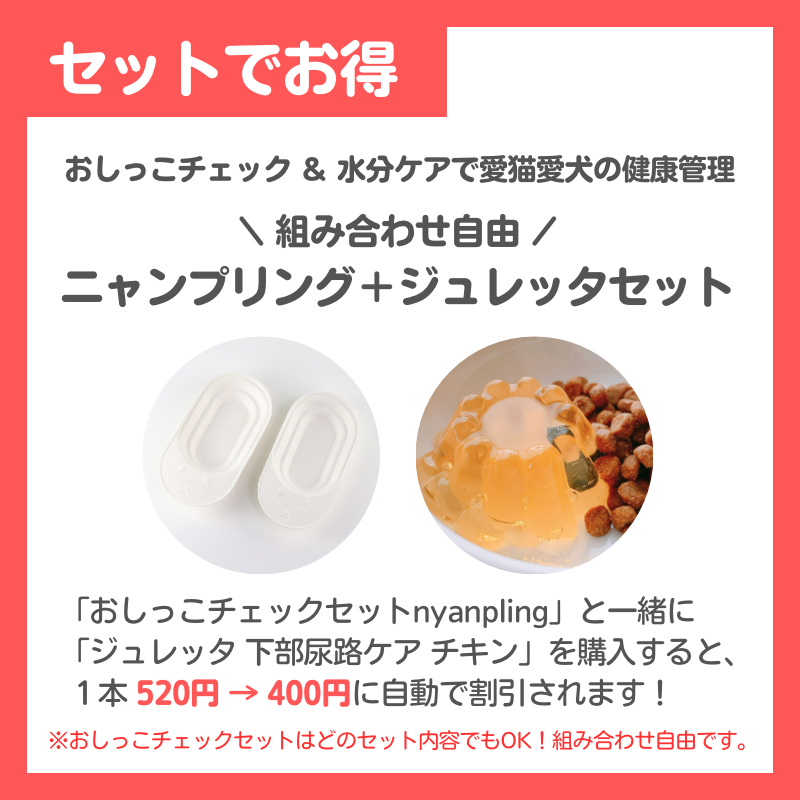 ニャンプリングの「おしっこチェックセット」と一緒に「ジュレッタ 下部尿路ケア チキン」を購入すると、ジュレッタが1本520円のところ、400円に!